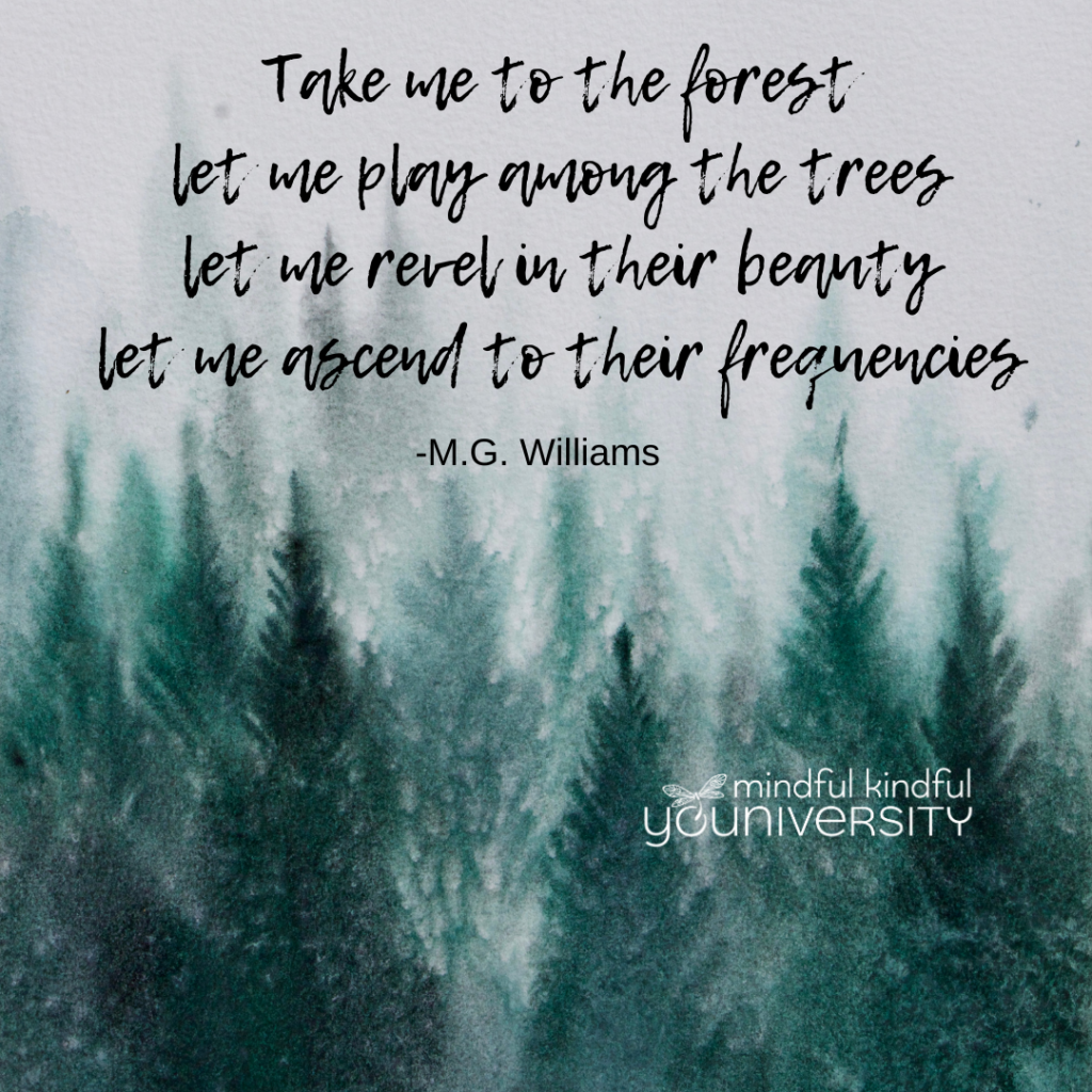 As your guide, I invite you to practice the essentials of mindfulness and self-care through a unique experience of mindfulness, meandering, and meditation. Together, we will attune to the forest through all of our senses, finding grounding and resonance amongst a supportive network of trees.